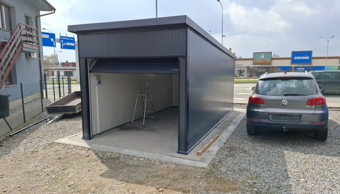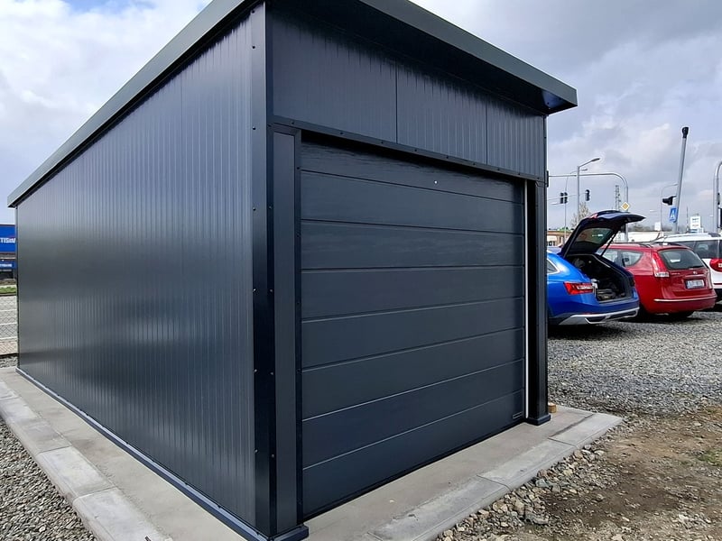 Zateplená garáž s elektroinstalací a automatickými vraty. Dálkové ovládání, fotobuňka, vnitřní osvětlení, elektrické zásuvky. Termín montáže po domluvě.