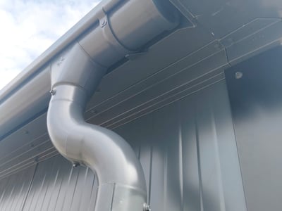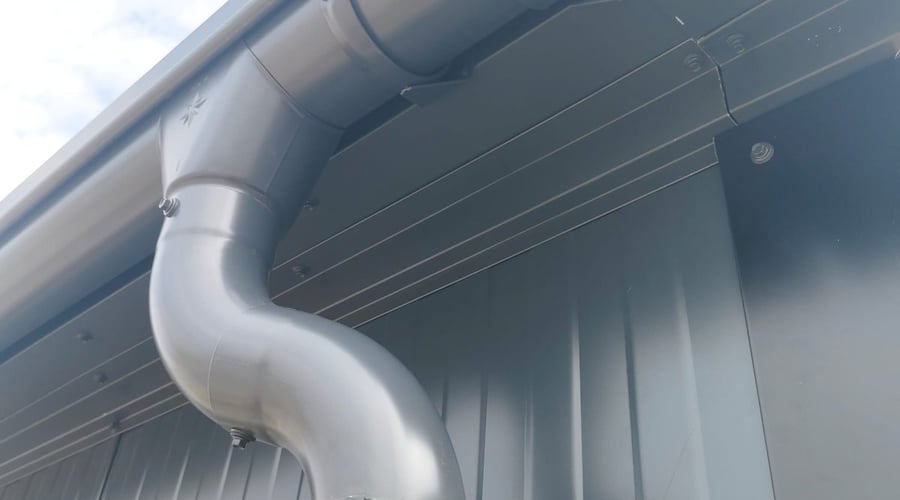 Okapový systém je kompletní — okap, rohy, svod. Voda ze střechy je vedená mimo obvod stavby, ne aby stékala po stěnách nebo se hromadila u základů.