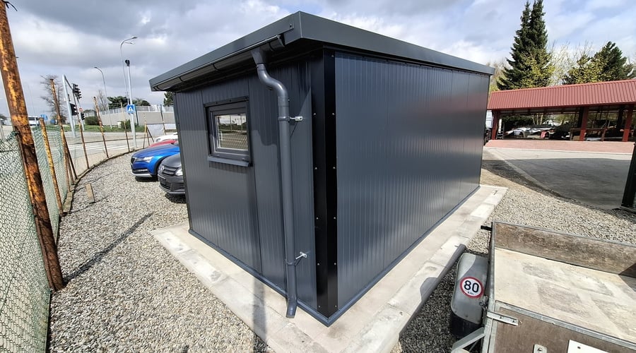 Stěny tvoří sendvičové PIR panely o tloušťce 80 mm. Stejné panely se běžně používají u nízkoenergetických rodinných domů. Vnitřní teplota tak zůstává stabilnější — v létě se garáž nepřehřívá na extrémní teploty, v zimě nechladne tak rychle jako tenký plech.