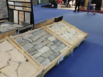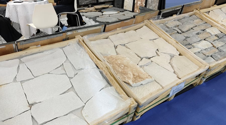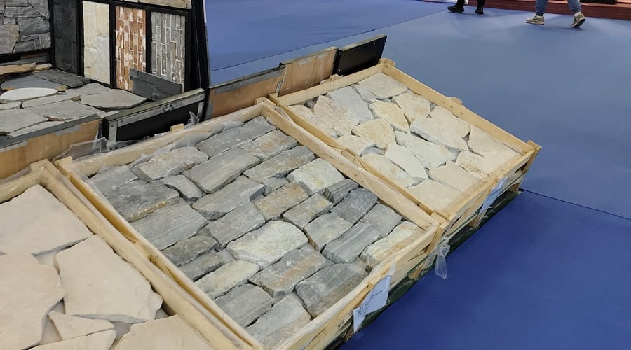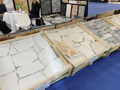Zaměřili jsme se hlavně na dlažbu a venkovní obklady — to, co má přímou vazbu na naše realizace. Břidlice, pískovce, žuly, různé formáty od velkoformátových desek po mozaiku z nepravidelných úlomků.